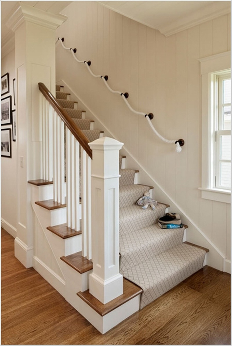 Để bớt đi sự trống trải, đơn điệu cho bức tường thì bạn có thể sáng tạo thêm 1 phần tay vịn được làm từ dây thừng gắn trực tiếp lên tường nhờ vào những móc treo cố định